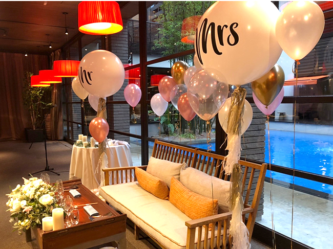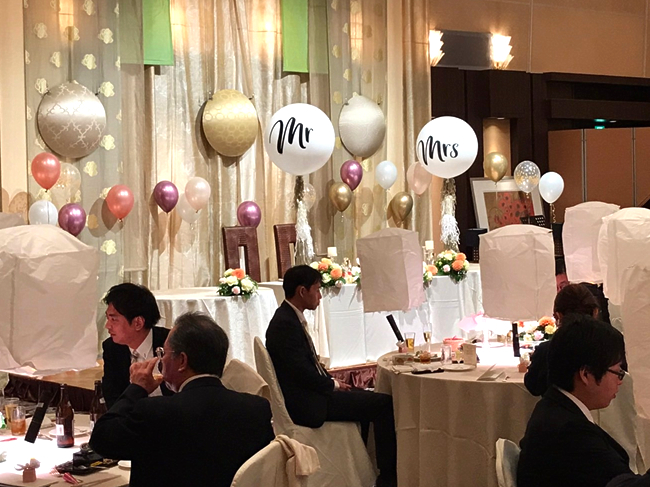Mr.&Mrs.のバルーンを用いて海外ウェディングをイメージした今流行りの装飾です。